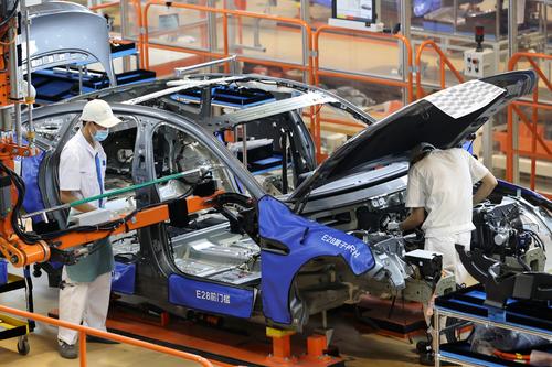 2021年4月18日,广东肇庆小鹏汽车生产基地,工人在组装新车。广东肇庆小鹏汽车智能网联科技产业园是小鹏汽车全球首个整车生产基地,设有冲压、焊装、涂料、总装以及Pack五大主体生产车间。2021年,该项目预计生产汽车7万辆,产值140亿。