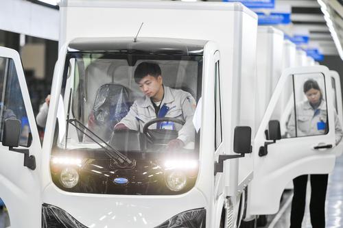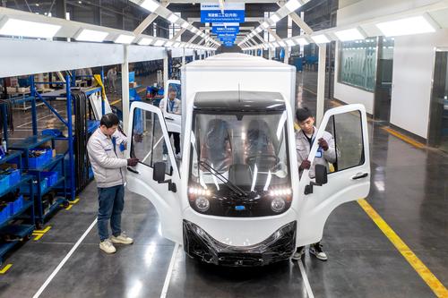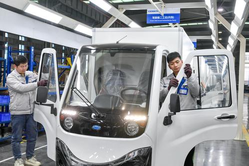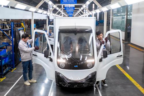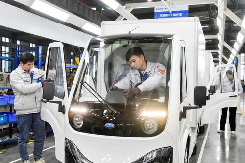 2022年2月23日,位于浙江省湖州市长兴经济技术开发区的浙江恒源机器有限公司,技术人员忙碌组装能源纯电动物流车SKD驾驶室。