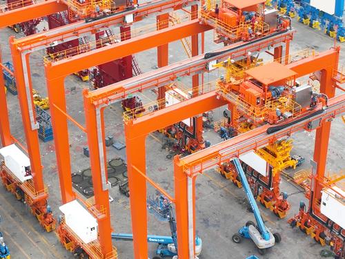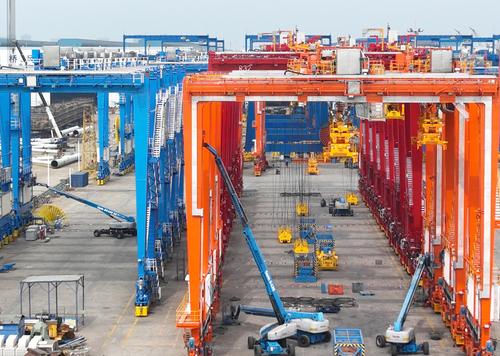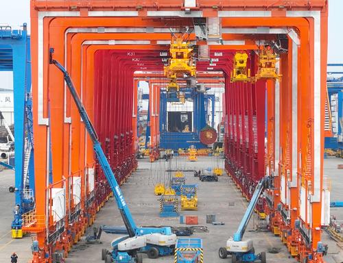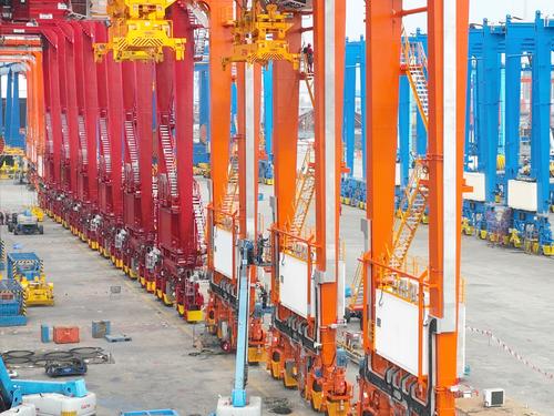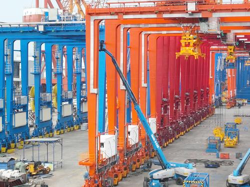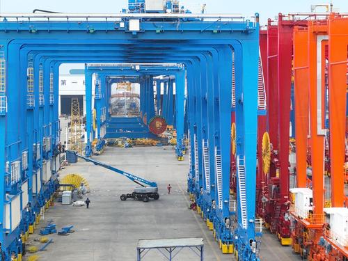 2023年2月28日,工作人员在上海振华重工南通基地调试即将交付的港机产品。据悉,今年2月15日,振华重工产品进入蒙古国,至此,振华重工产品已进入106个国家和地区,承担了全球约70%的自动化码头项目建设。