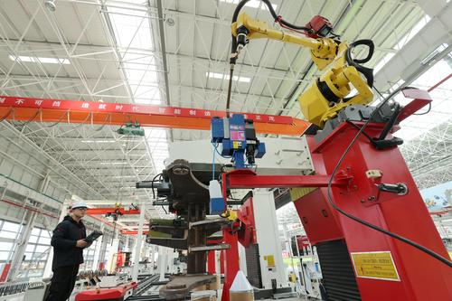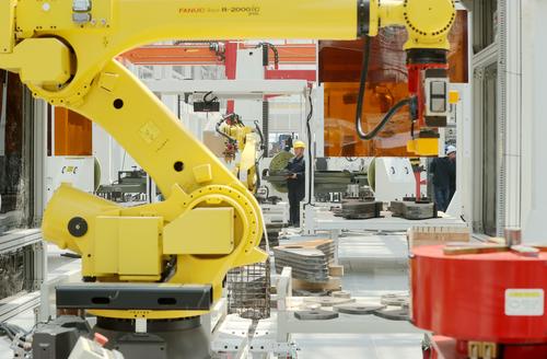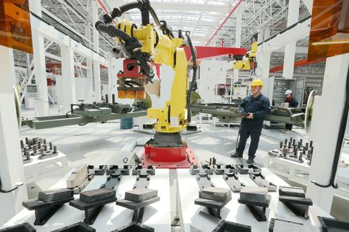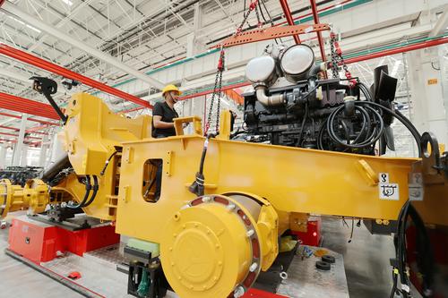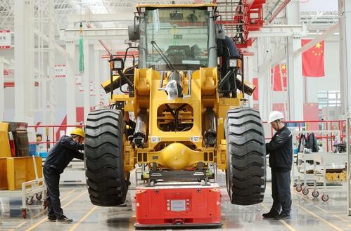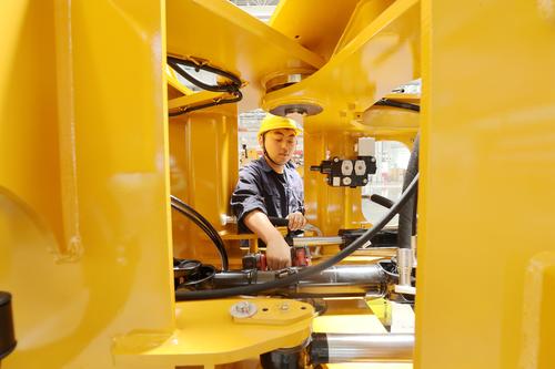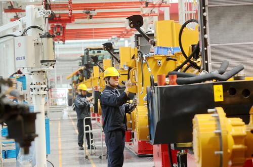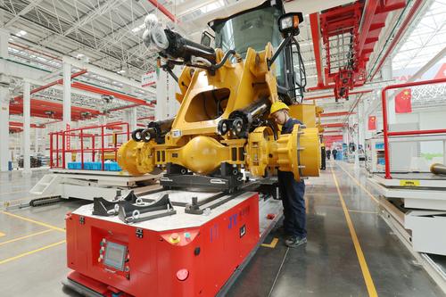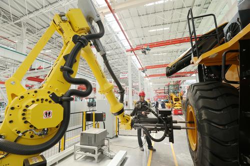 2023年4月27日,在浙江省湖州市吴兴高新区的三一装载机智能制造基地,工人在调试智能化生产线。