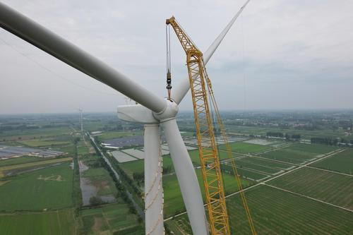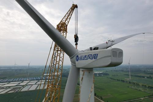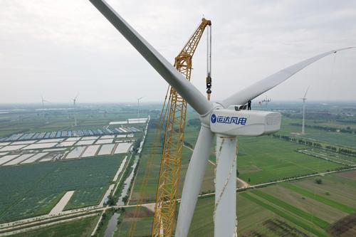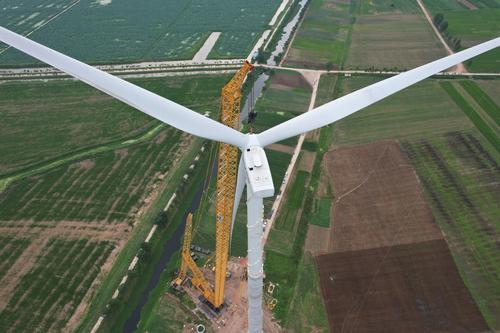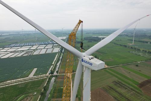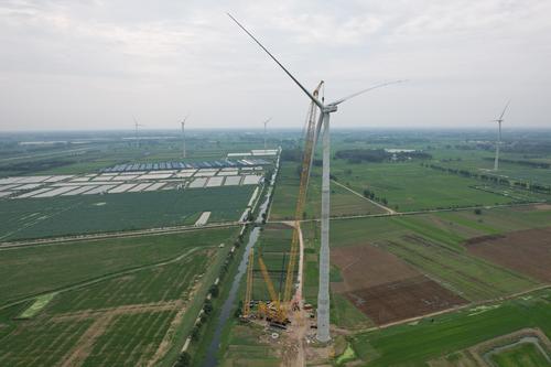 2023年7月13日,在安徽省阜阳市阜南县洪洼地区地城镇境内,一台160米高的风电塔叶轮安装成功。