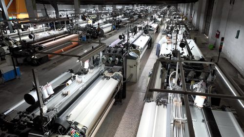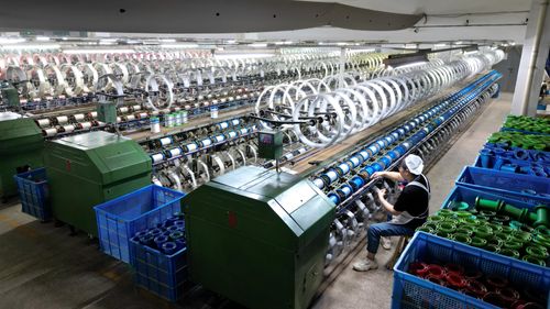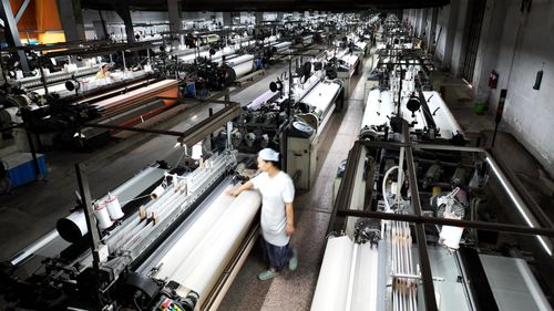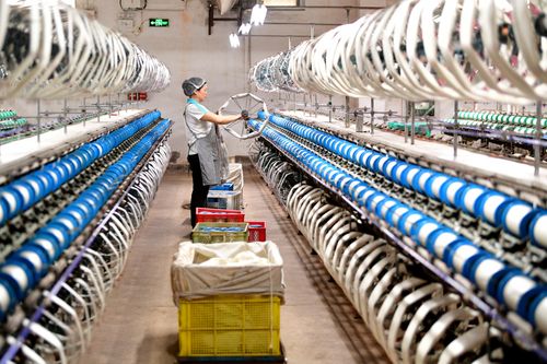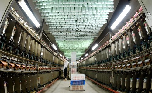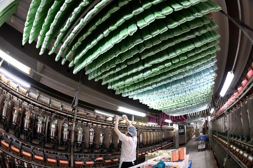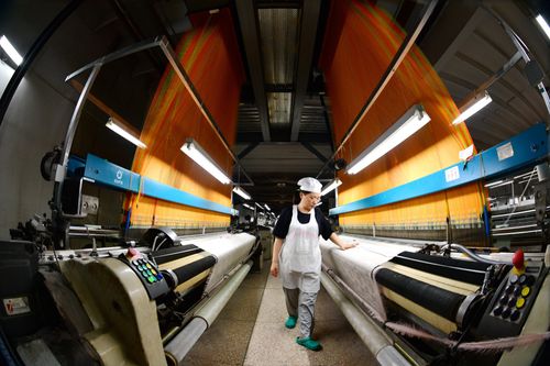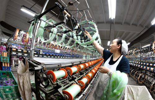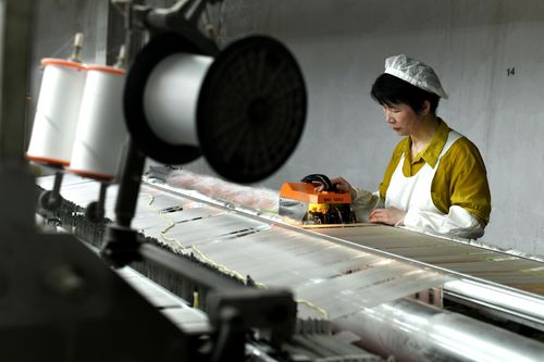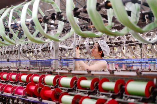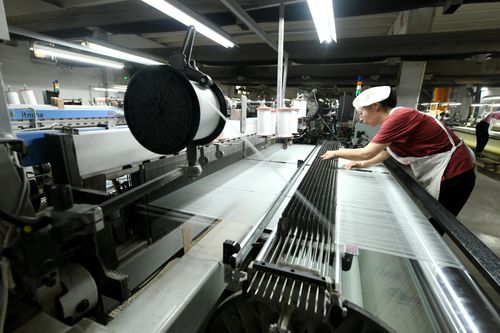2024年7月2日,江苏海安,在全国首批农业产业化国家重点龙头企业——鑫缘茧丝绸集团股份有限公司,工人在坯绸织造、丝线准备等车间赶制订单产品。