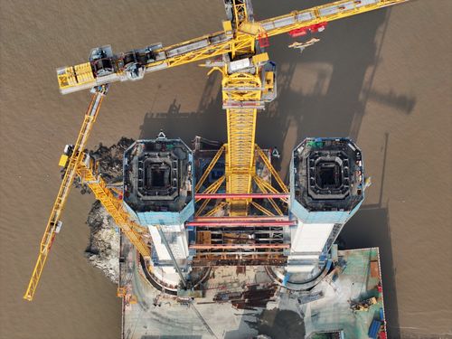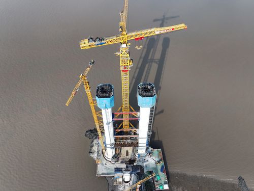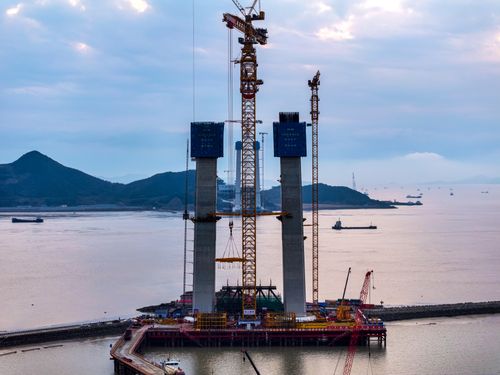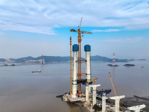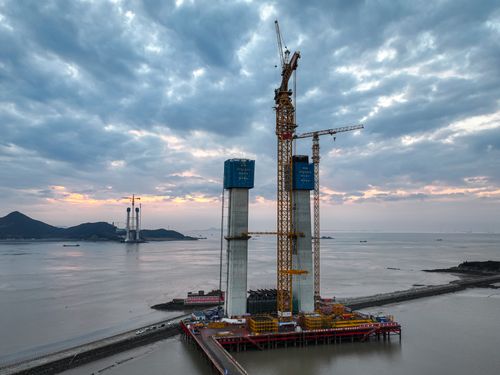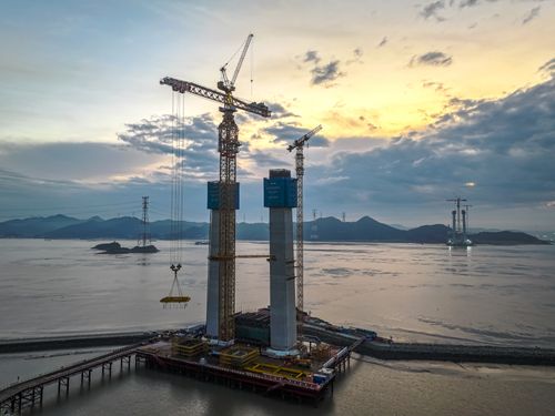 浙江舟山:双屿门特大桥索塔建设双双超百米