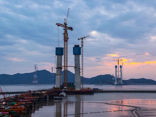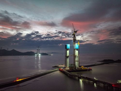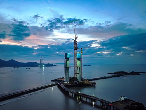 2025年1月5日晨,建设中的浙江省舟山市六横大桥二期工程双屿门特大桥在晨曦中显得格外壮观。双屿门特大桥是宁波舟山港六横公路大桥的组成桥梁之一,连接六横岛与佛渡岛两座独立海岛,是世界跨度最大的单跨吊钢箱梁悬索桥,同时也是中国跨度最大的跨海桥梁,将中国跨海桥梁最大跨度刷新至1768米,该大桥索塔采用门形型钢混凝土桥塔,塔高分别为246.3米、254米,由中国铁建大桥工程局、中国铁建港航局联合承建。目前,两座主塔建设均超百米(六横岛侧索塔141米,佛渡岛侧索塔102米)。大桥建成后,对完善浙江省高速公路网络,推进浙江舟山群岛新区和海洋经济发展示范区建设,促进宁波舟山港六横港区发展意义深远。