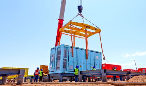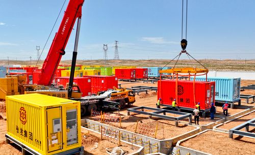 连日来,甘肃省张掖市临泽县北部滩新能源产业园300MW/1200MWh独立共享储能电站建设现场,工程车往来穿梭、,一座座储能电池集装仓被大型吊车吊臂随着指令从运输车上起吊,在工人们的协助下平稳的降落在平台上,技术人员立即进行安装和调试,加紧5MW/20MWh储能单元吊装调试工期,确保共享储能电站十月建成运行。