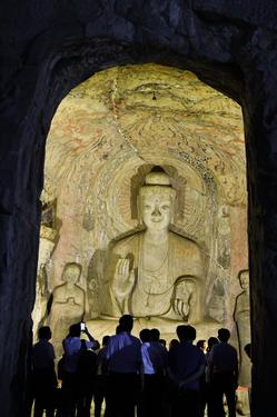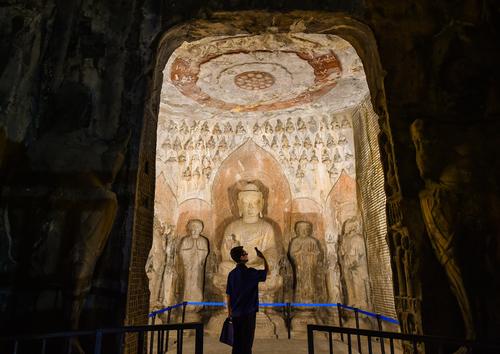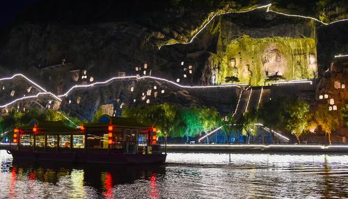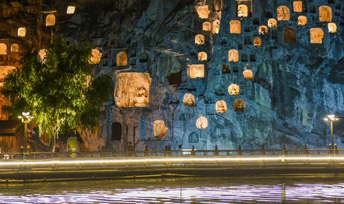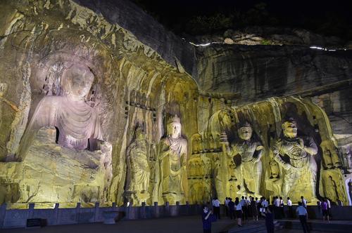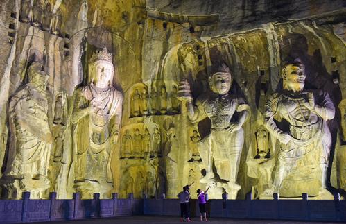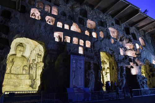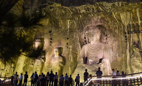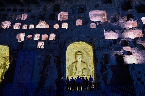 2020年6月5日晚,河南洛阳,游客欣赏夜幕下的世界文化遗产-洛阳龙门石窟“卢舍那大佛”等佛像。