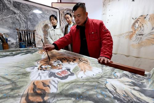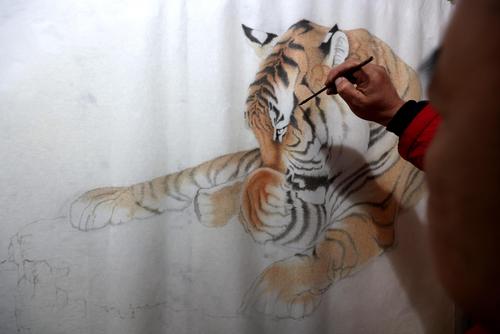 山东枣庄:民间艺人画虎迎虎年