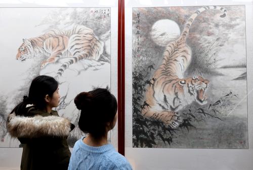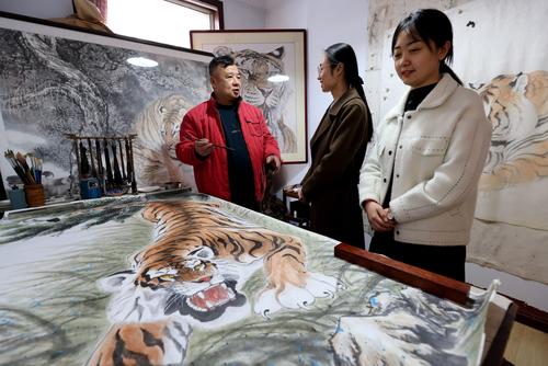 新年将至,山东省枣庄市光明路街道石碑社区民间艺人靳学勤创作出不同风格的老虎画100多幅,并在庭院中免费向居民展出,让大家乐享“虎威”趣味,迎接虎年的到来。