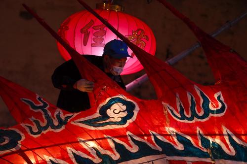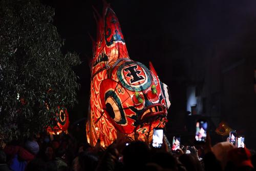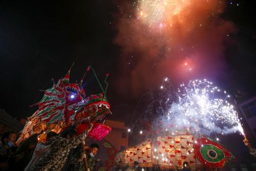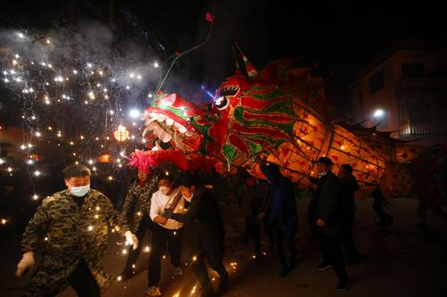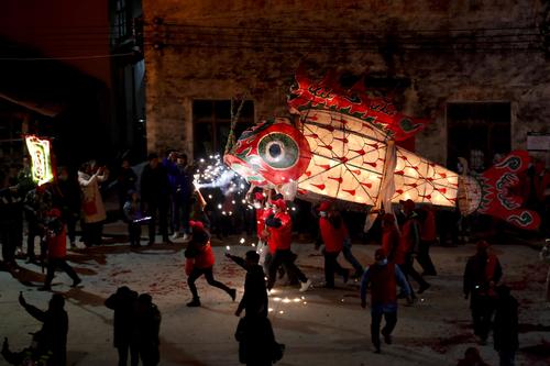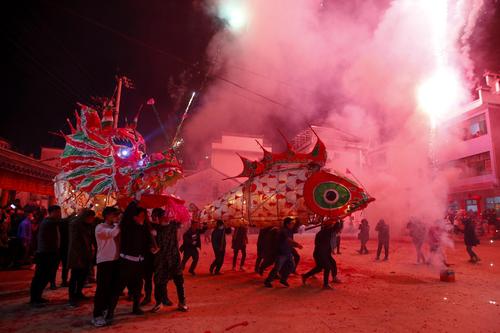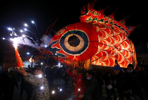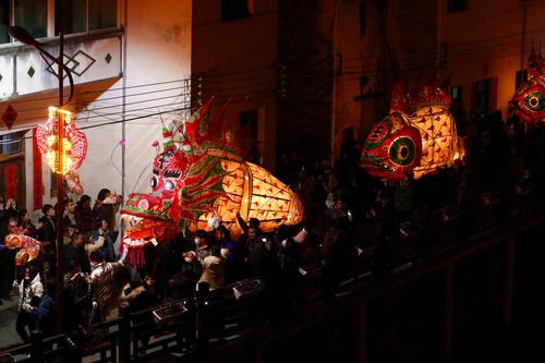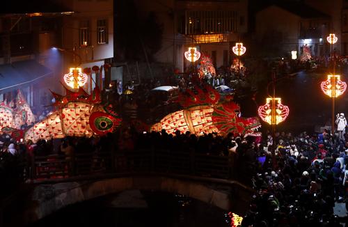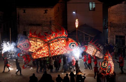 2022年2月16日,在安徽省黄山市,汪满田鱼灯表演队伍正在村中嬉游祈福。
