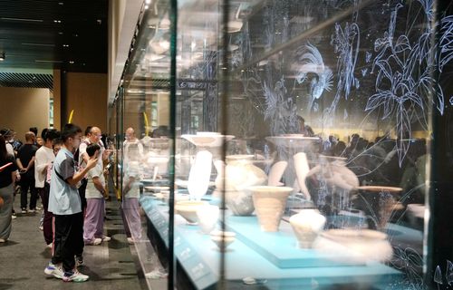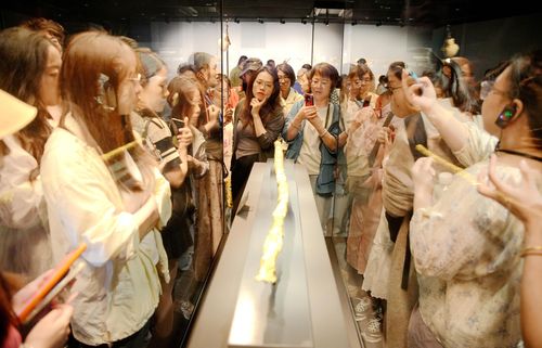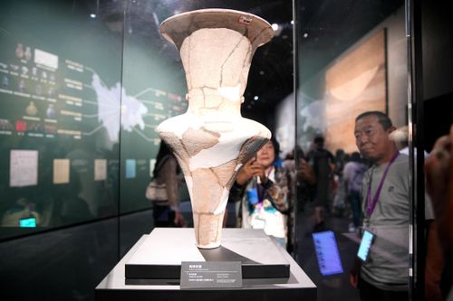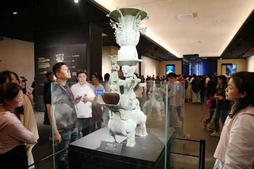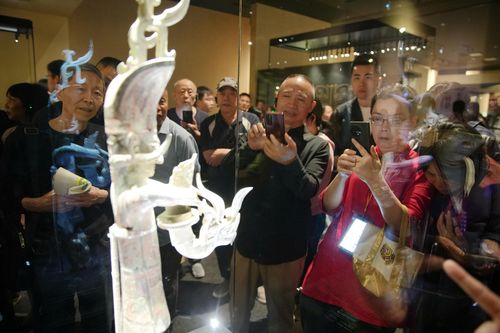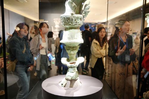 2024年4月26日,参观者在四川省广汉市三星堆博物馆内欣赏展品,感受古蜀文化的神秘魅力。三星堆是我国西南地区迄今所知规模最大、延续时间最长、文化内涵最丰富的先秦时期遗址。