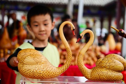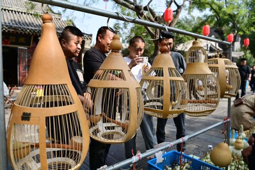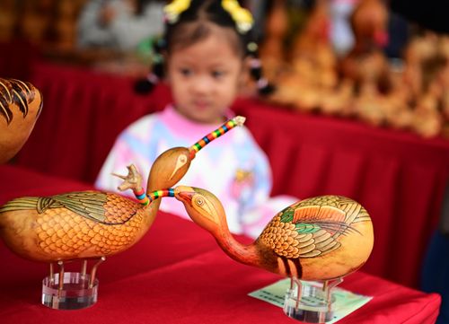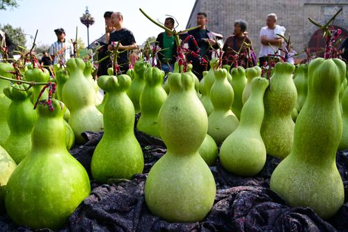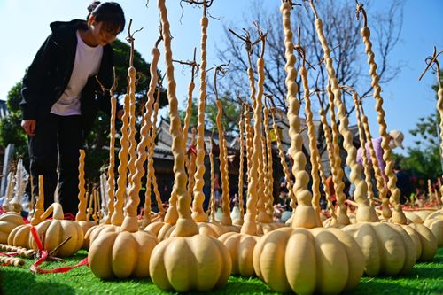 2024年10月13日,山东省聊城市,在中华水上古城景区举办的第十六届中国江北水城·两河明珠(聊城)葫芦文化艺术节中,来自全国不同地域、不同民族通过烙花、雕刻、砑花、绘花、拼接、范制、勒扎、打结、彩绘等工艺手法制作的近千个品种的工艺葫芦争奇斗艳,令人目不暇接。