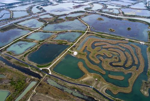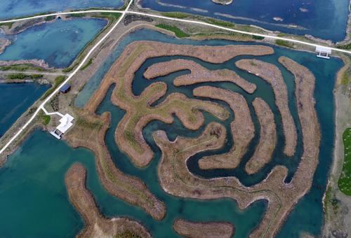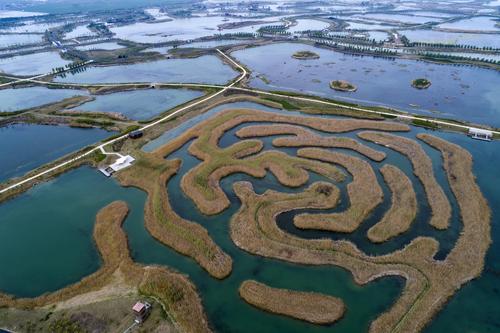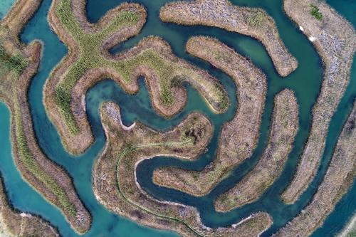 2020年4月6日,江苏省淮安市,航拍白马湖湿地公园中的芦苇迷宫。据悉,白马湖湿地公园是以“退圩还湖”后保留的纵横交错田埂和塘圩为基础而建设的圩梗湿地,2015年底获批国家湿地公园(试点)。