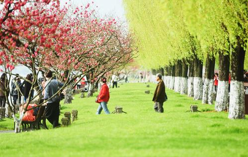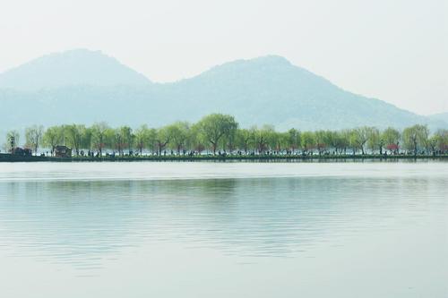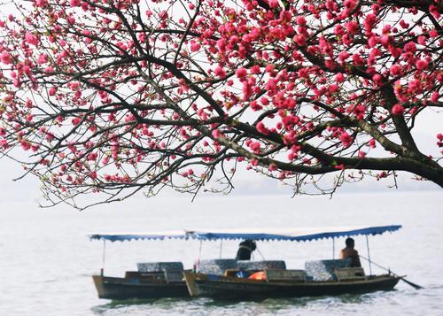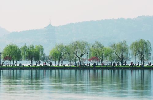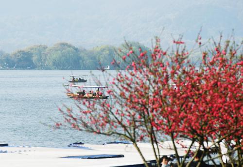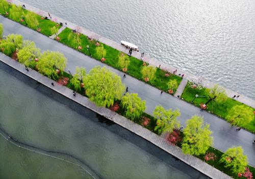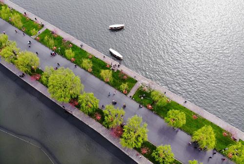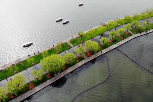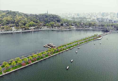2021年3月24日,航拍春日中的杭州西湖白堤。杭州西湖白堤上桃红柳绿,吸引了不少市民游客前来泛舟西湖和、踏青赏桃,感受春日美景。