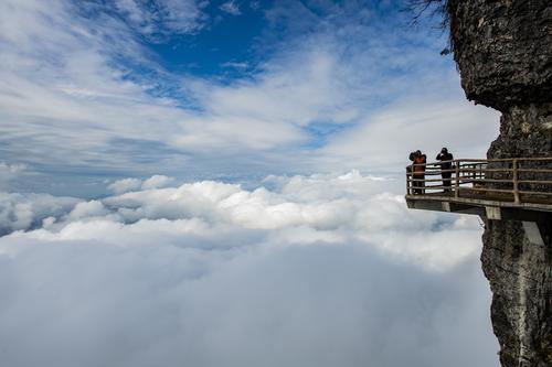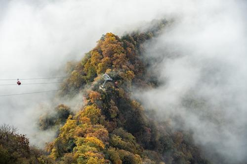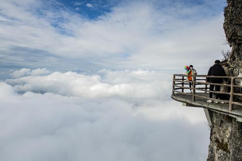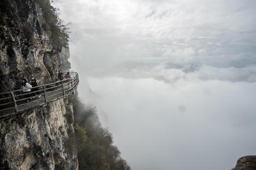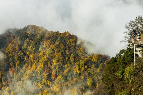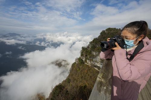 2021年10月28日,游人在龙头山旅游景区空中栈道拍摄云雾美景。近日,位于川陕交界的陕西省汉中市南郑区龙头山旅游景区云雾缭绕,层林尽染,如火似霞的红叶点缀着连绵起伏的山峦,构成了一幅迷人的山水画卷。