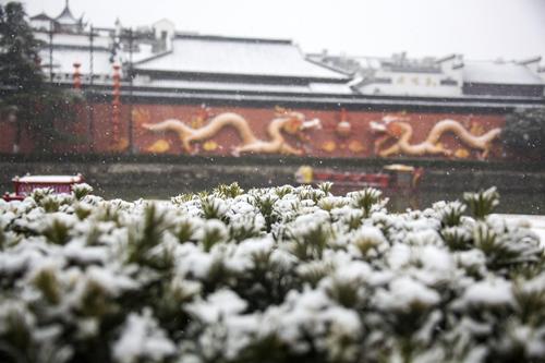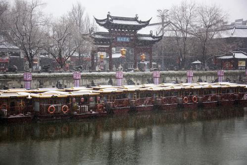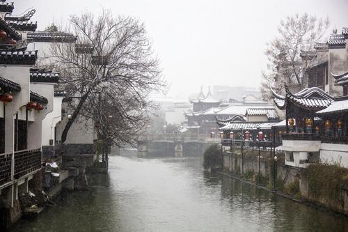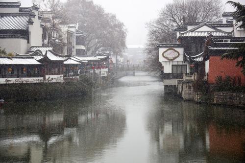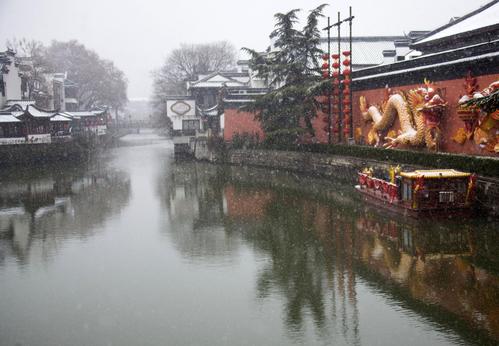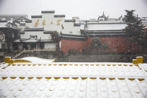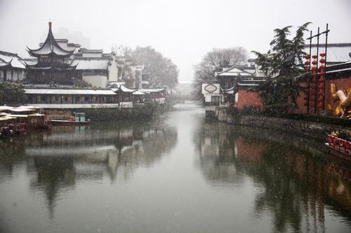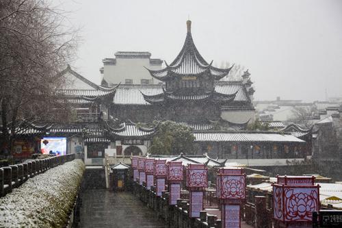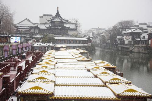 2022年2月7日,一场春雪使得南京夫子庙景区秦淮河两岸银装素裹,景色格外靓丽。