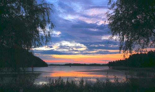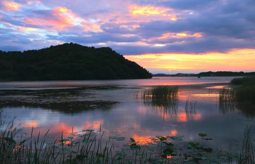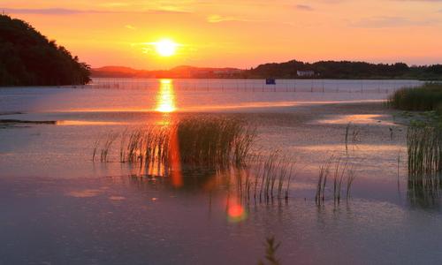 2022年6月21日,安徽省合肥市庐江县罗河镇青山湖湿地保护小区水映霞光,景色如画。