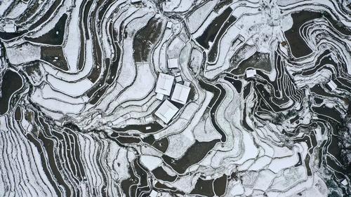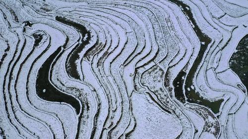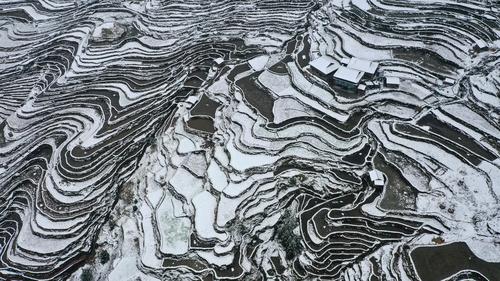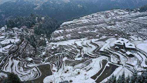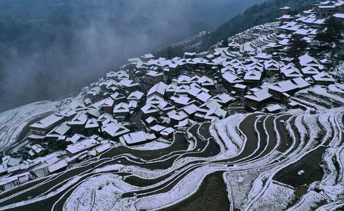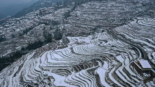 近日,贵州省黔东南苗族侗族自治州从江县出现降雪天气,雪后的加榜梯田一片银装素裹。蜿蜒曲折的田埂、层层叠叠的梯田、青瓦木屋的民居交相辉映,宛如水墨画卷。