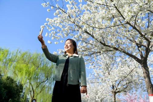 2023年3月13日,市民在河南省洛阳市洛浦公园南堤“樱花大道”内休闲。