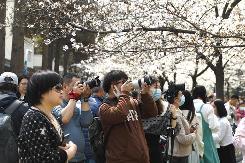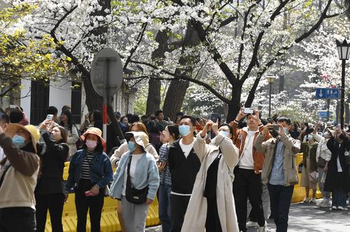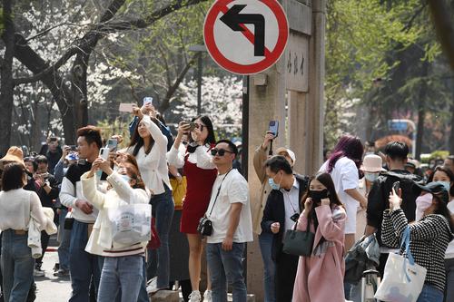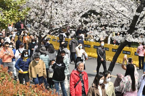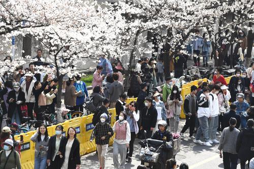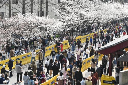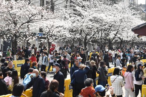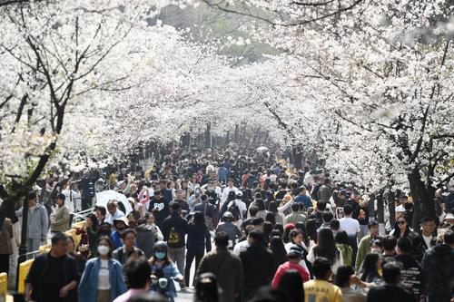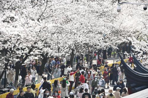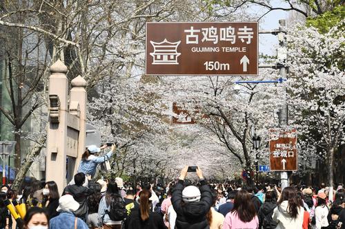 2023年3月15日,江苏省南京市鸡鸣寺樱花大道上樱花全部盛开,进入最佳观赏期,吸引众多游客前来观赏。