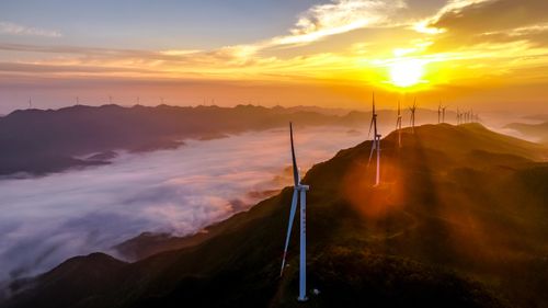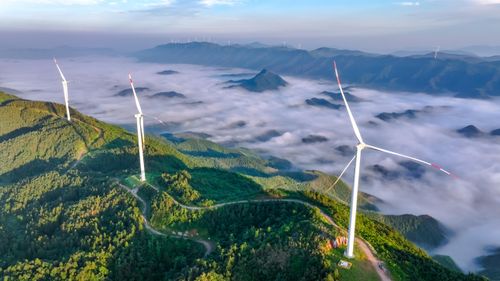 2024年6月13日,江西省瑞昌市洪下乡蜈蚣山风电场,一台台发电机矗立在群山、云海之中,勾勒出一幅仙境般的美丽画卷。