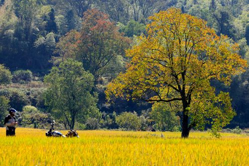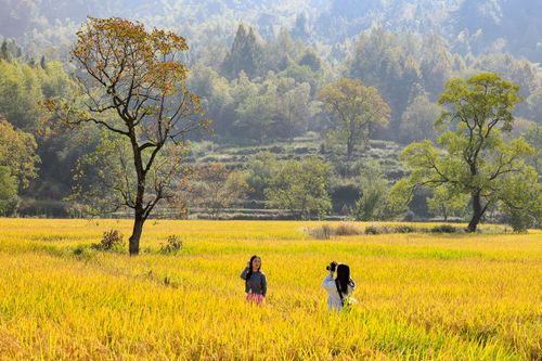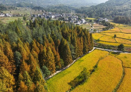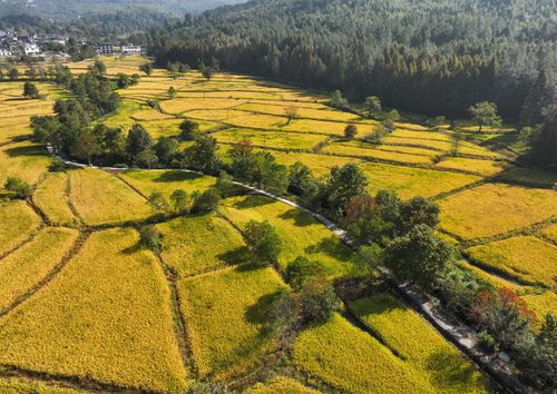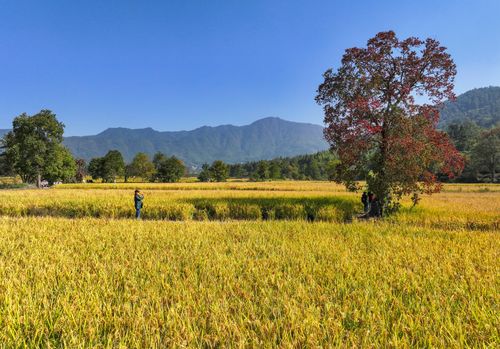 当日是霜降节气,秋雨初霁的安徽省黄山市黟县宏村田园风光旖旎,金灿灿的稻田和渐次泛红的乌桕树相映成趣,秋意浓浓。