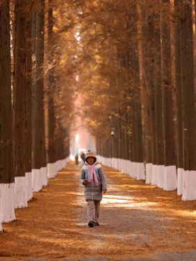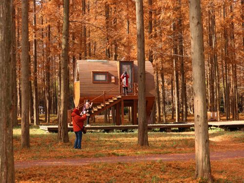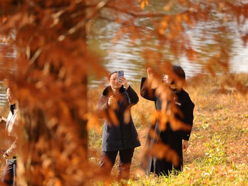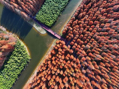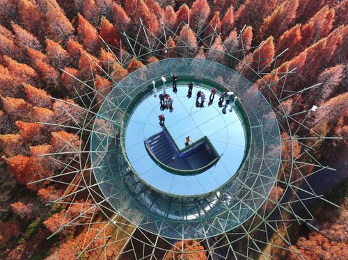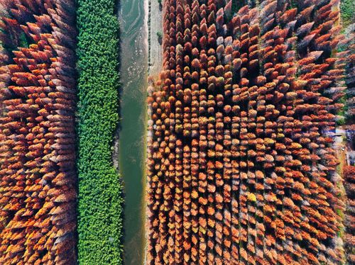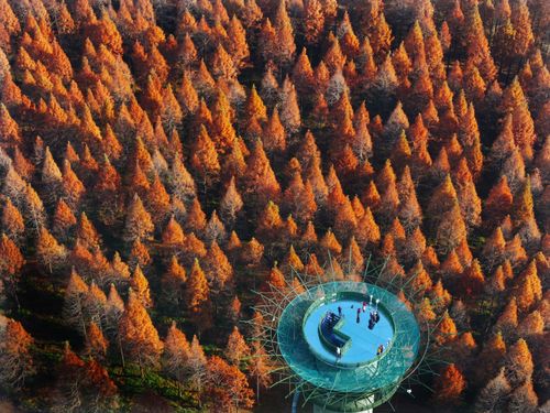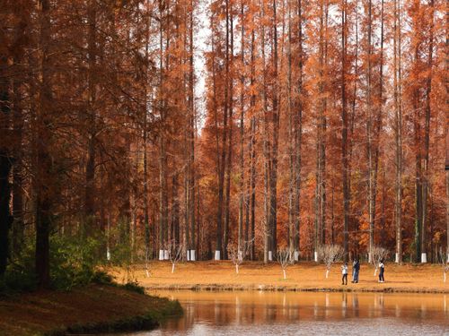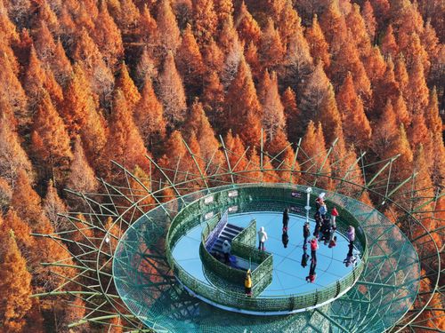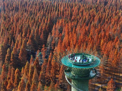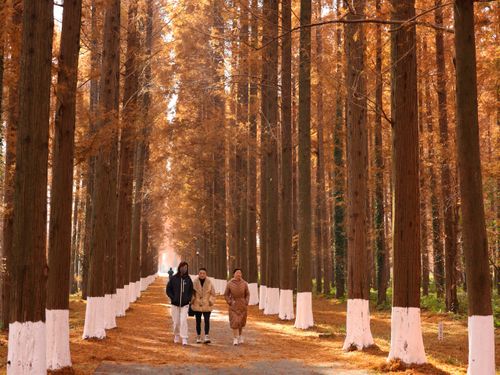 2024年12月14日,江苏省盐城市东台市,游客在黄海国家森林公园中游玩、赏景。仲冬时节,盐城市东台市黄海国家森林公园的水杉林进入最佳观赏期,数万亩水杉林层林尽染,色彩斑斓,景美如画,吸引众多游客观光游览。