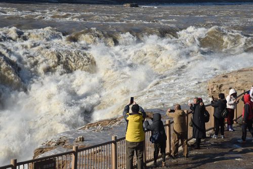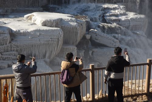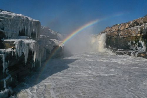 山西吉县:黄河壶口瀑布现冰挂彩虹景观