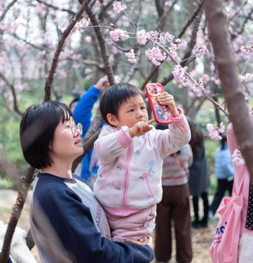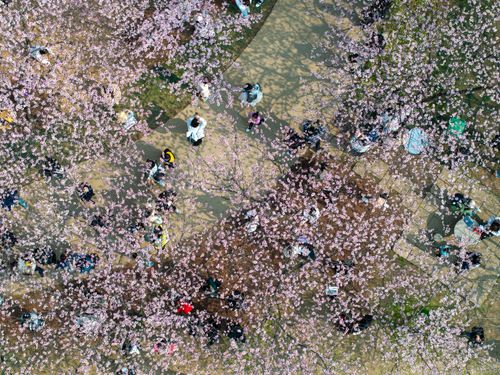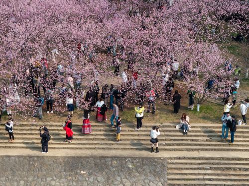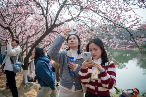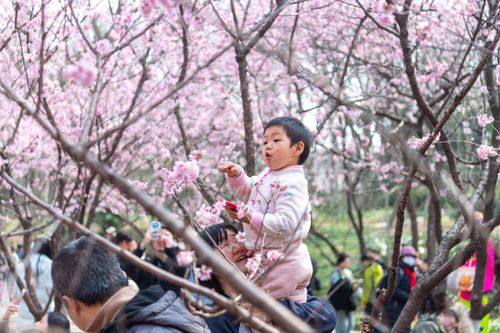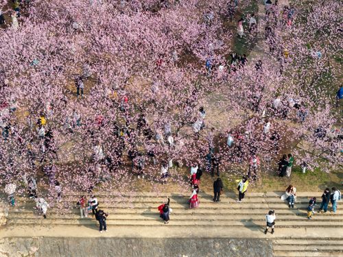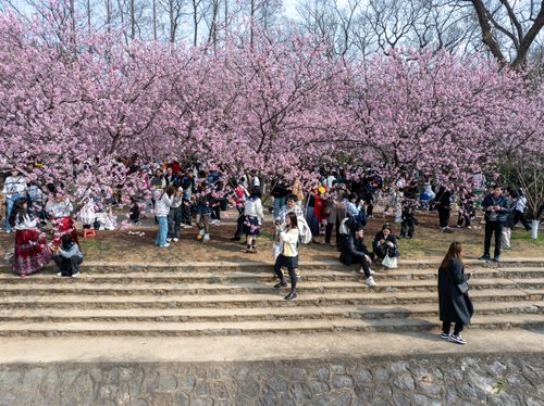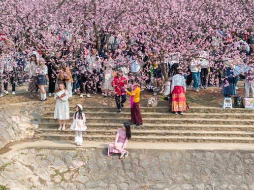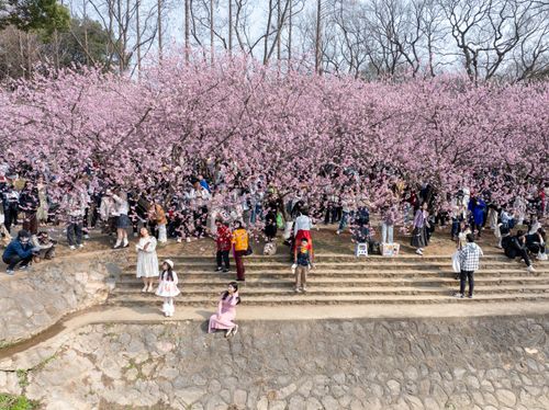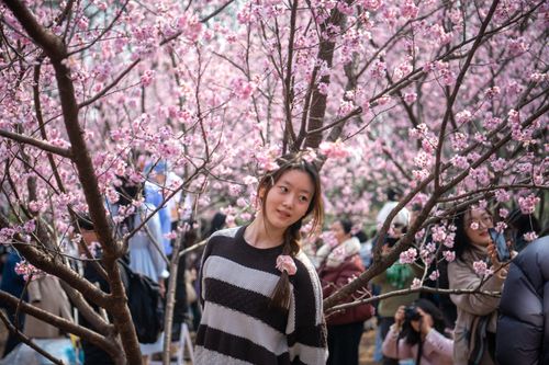 2025年3月8日,南京中山植物园北园樱花大道上的椿寒樱已全面盛开,吸引游客前来赏樱游玩。
