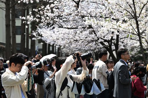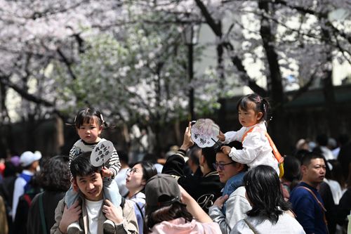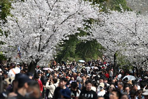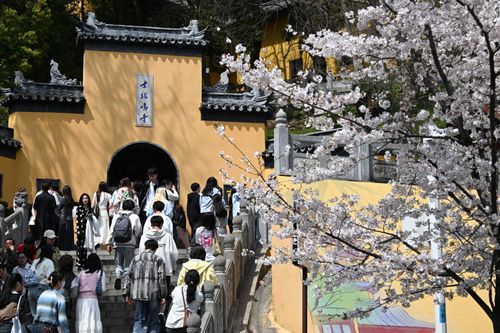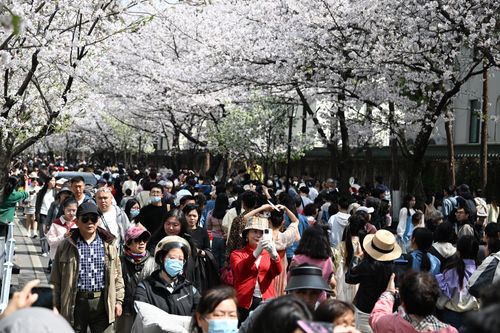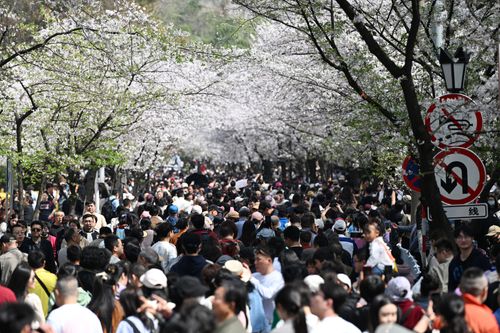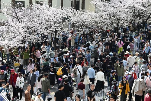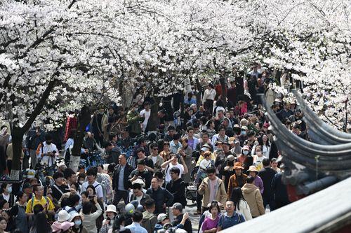 2025年3月24日,江苏南京,鸡鸣寺路的樱花进入最佳观赏期,赏花游客人头攒动。