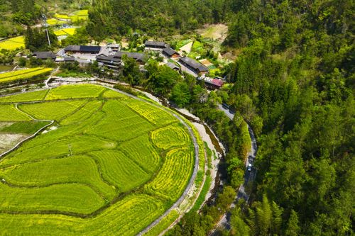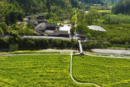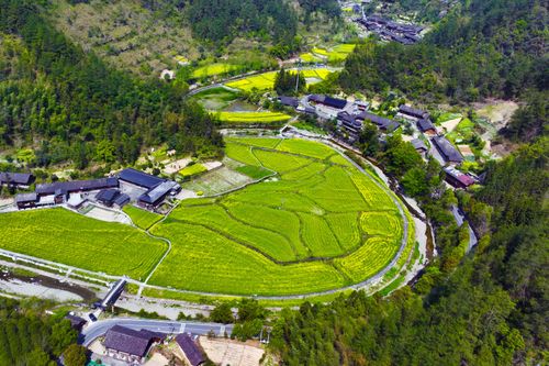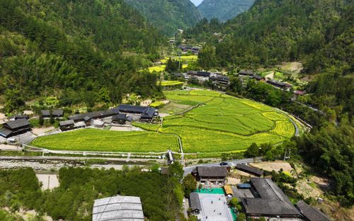 2025年4月10日,重庆市黔江区小南海镇新建村土家十三寨的油菜花田与民居相间,美不胜收。