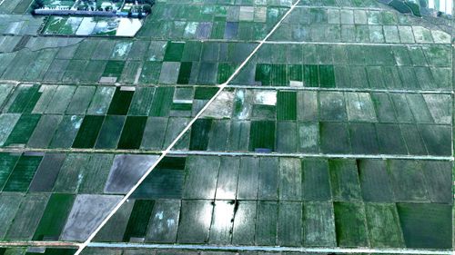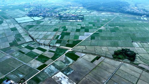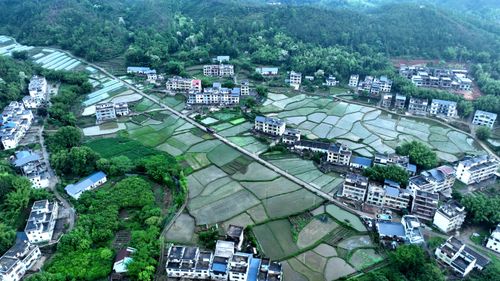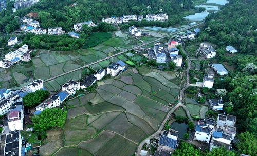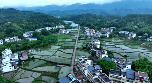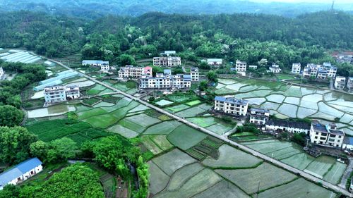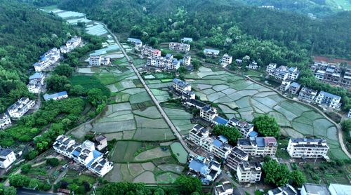 2025年5月8日,江西省遂川县枚江镇乡村,错落房舍静卧于葱郁山林怀抱,纵横田埂如大地脉络延展。