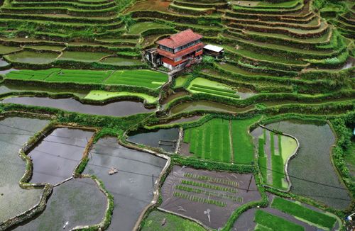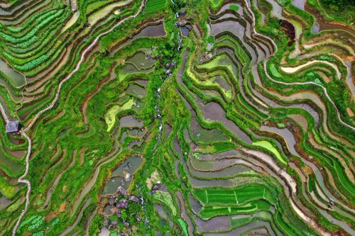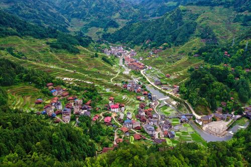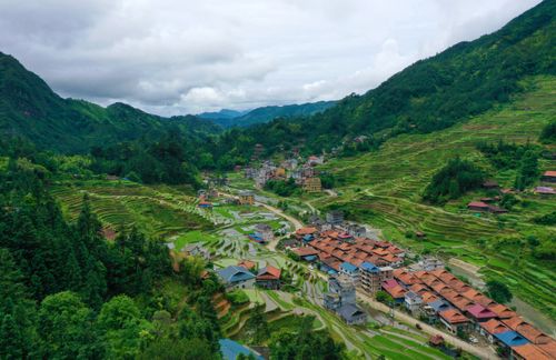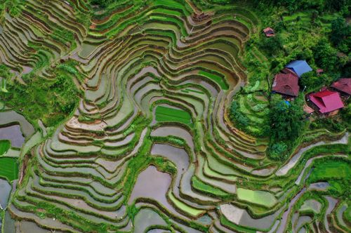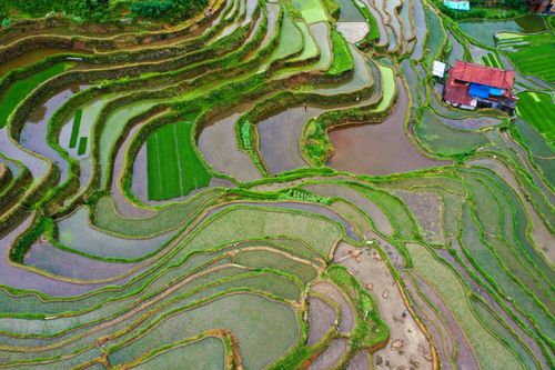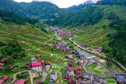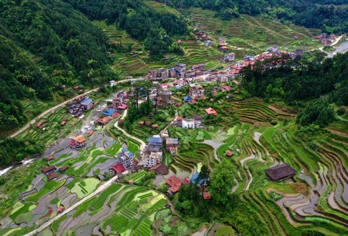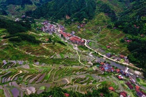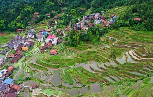 2025年5月18日,在广西融水苗族自治县安太乡培秀苗寨,青山环抱着梯田,苗寨点缀其间,如诗如画,美不胜收。小满到,夏意浓。广西融水苗族自治县安太乡培秀苗寨的梯田蓄水丰盈、层层叠叠、线条分明,宛如大地指纹,蔚为壮观。