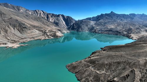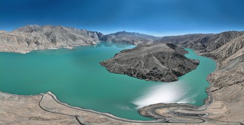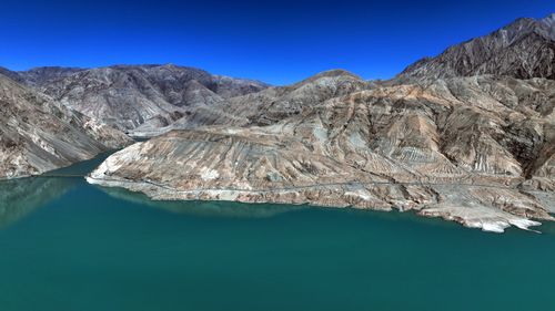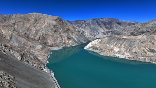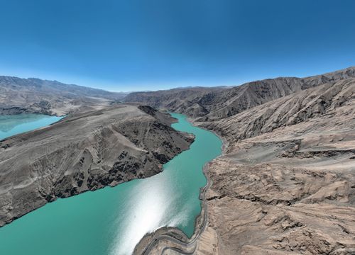 班迪尔蓝湖位于新疆维吾尔族自治区喀什地区塔县境内的班迪尔乡,距离塔县县城约30公里,是塔县境内的一个水库,也叫下坂地水库或坎儿洋龙池。班迪尔蓝湖因为水中矿物质成分的原因,湖水呈现出深邃的蓝色,与周围的灰白岩层和雪山相映成趣,形成了一种冰冷而神秘的美感。班迪尔蓝湖不仅有着深邃神秘的蓝色水域,还有着灰白岩层和雪山的陪衬,形成了一种冰与火的对比,给人一种冷艳而震撼的感觉。