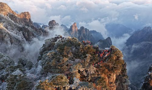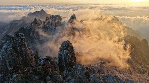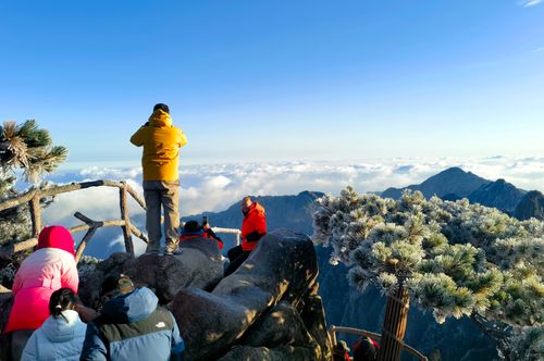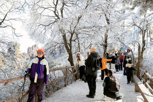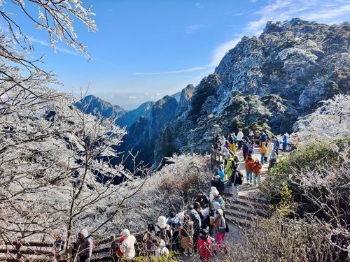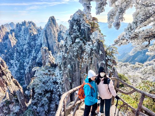 2025年11月18日,游客在安徽黄山风景区观赏雾凇和云海。11月17日下午,受冷空气和降雨影响,安徽黄山风景区迎来今冬首场雾凇,一夜之间,枝头树梢银装素裹,晶莹的冰凌点缀奇峰怪石。11月18日,云海如约“助阵”,与雾凇“联动”,形成一幅宛如童话的冰雪仙境。