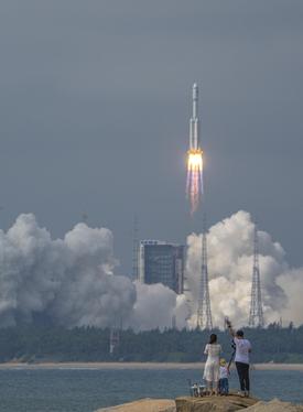 2022年11月12日,在海南文昌航天发射中心,长征七号遥六运载火箭将天舟五号货运飞船托举升空,飞船顺利进入预定轨道。此次发射的天舟五号货运飞船是空间站“T”字构型组装完成后,首艘访问的飞船。在文昌淇水湾的海滩上,火箭升空的一幕被定格在来自全国各地航天爱好者的相机、手机中。