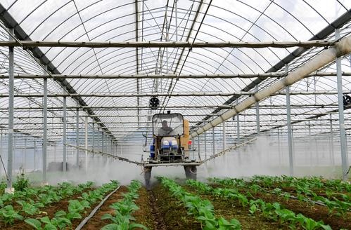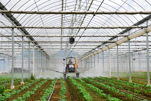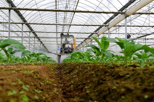 2022年1月17日,江苏省太仓市璜泾镇现代农业园区智能蔬菜大棚内,管理人员驾驶高地隙植保机对松花菜进行田间管理。近年来,璜泾镇现代农业园着力打造“菜蓝子”项目和农业农村部农业产业强镇示范建设项目,新增投入3000多万元用于蔬菜产业化示范基地建设和蔬菜农机社会化服务建设,配备了蔬菜植保机、移栽机、起垄机、水肥一体机、草头收割机、电动播种机等20余台套农业机械,园区650余亩蔬菜的种植、采收机械化率达80%。