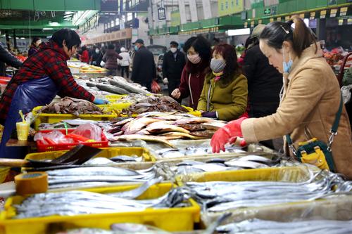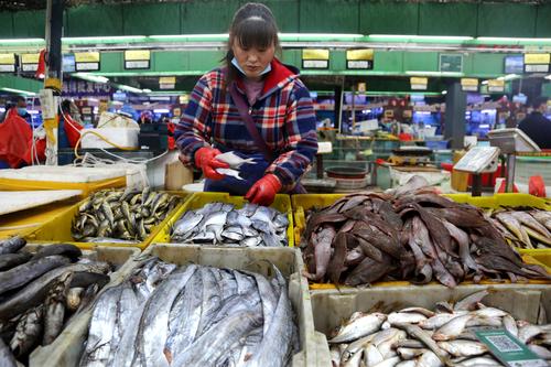 2020年4月9日,市民在连云港市连云区一家大型海鲜批发市场选购新鲜海产品。近日,随着国内防控疫情形势持续向好,连云港市连云区海鲜销售市场复工以来稳步回升,往日人气渐渐恢复,摊位上大量马鲛鱼、带鱼、黄鱼、梭子蟹、安康鱼、龙虾等海鲜纷纷上市,经营商户通过打冰包、物流、快递寄件等方式增加销售。