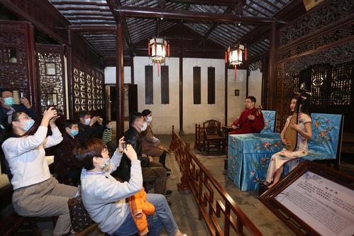 2020年4月17日晚,游客在江苏苏州古典园林网师园欣赏苏州评弹。自4月16日起,江苏苏州古典园林网师园恢复实景版游园今梦演出,吸引了众多游客前来游园,感受别样古典园林的夜色之美。