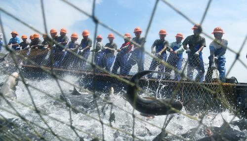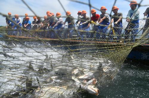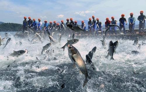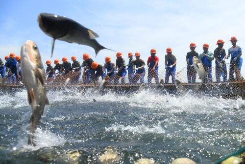 7月12日,浙江省杭州市淳安县千岛湖开展新安江大坝泄洪后的第一场巨网捕鱼,丰收5万余斤“胖头鱼”。