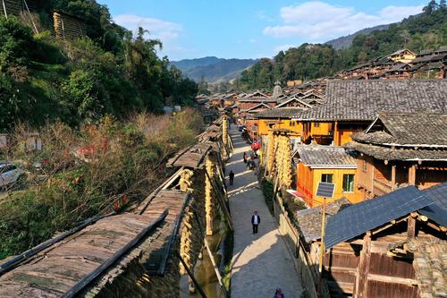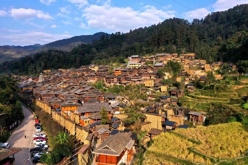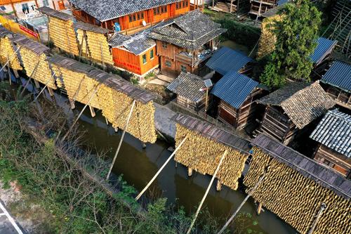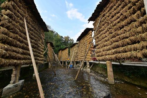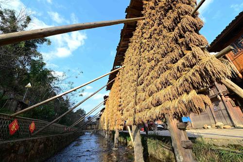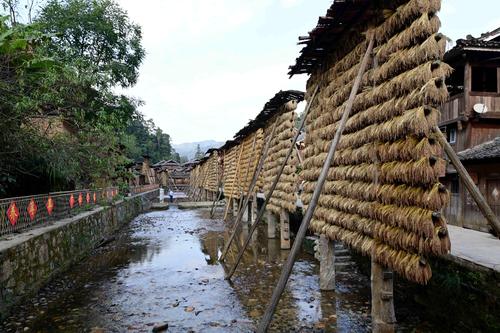 2020年11月7日,在贵州省从江县高增乡占里村,侗族村民将收割的糯稻谷挂满禾晾架。立冬时节,贵州省黔东南苗族侗族自治州从江县高增乡占里村侗族村民将丰收的糯稻谷晾晒在禾晾架上,村头寨尾小溪边一个挨着一个,一排连着一排。