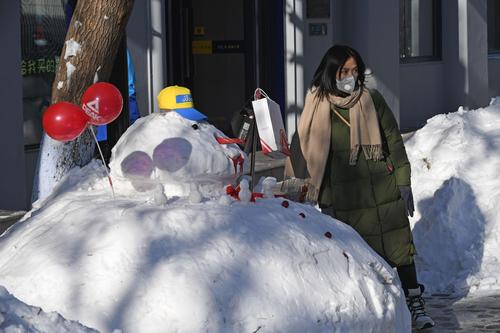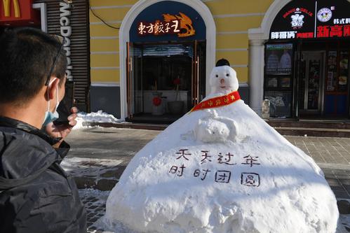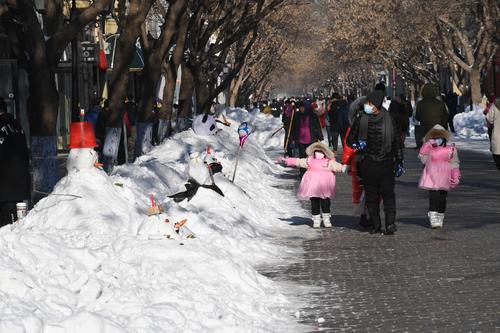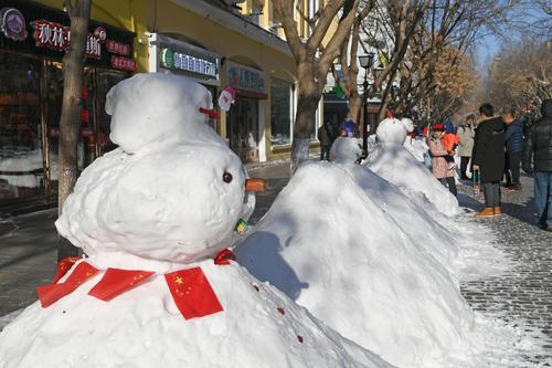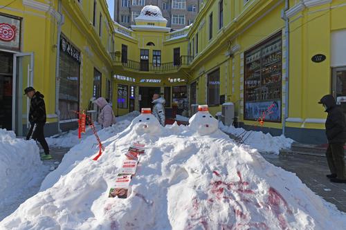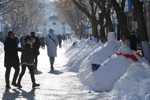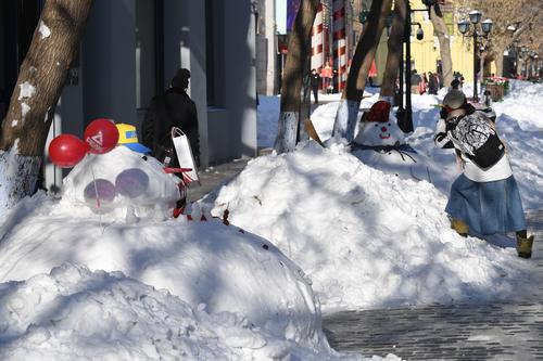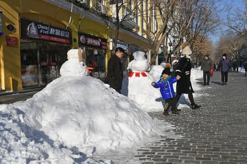 2020年11月22日,经过一场暴雪之后,在哈尔滨百年老街中央大街上,积雪被堆成各式各样的雪人,水桶、胡萝卜、糖葫芦、商家销售员绶带甚至小国旗都成了雪人装饰品,成为游人欣赏的一景,纷纷合影留念。