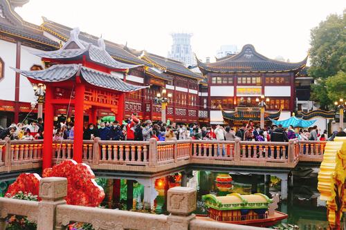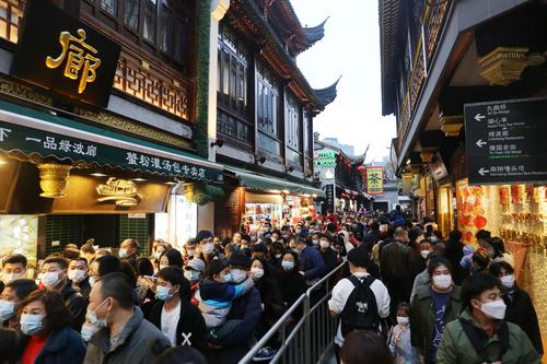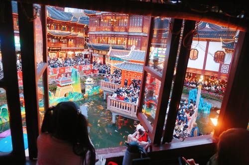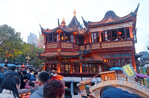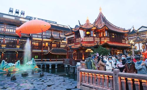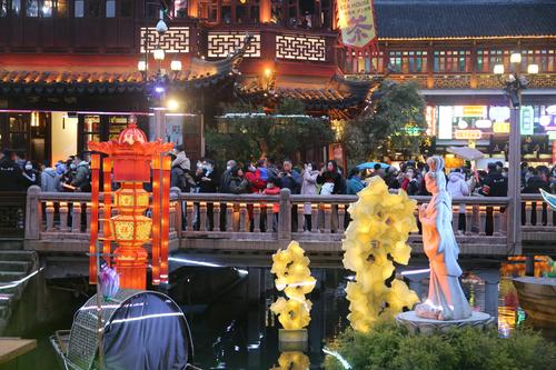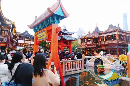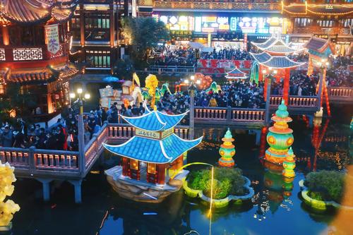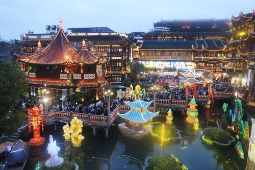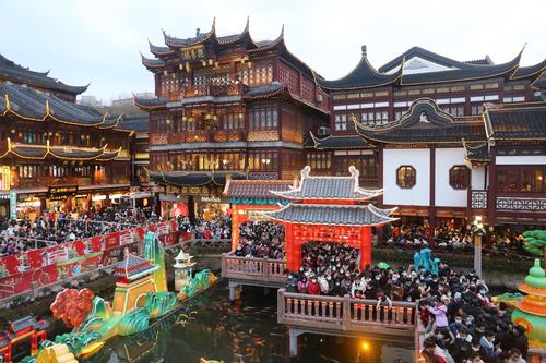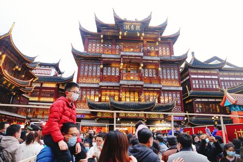 2021年2月12日,上海,豫园传统春节民俗文化艺术灯会摆脱了1月所受新冠疫情影响,申城旅游地标再现“人从众”热闹景象,不少游客排队两小时才能上九曲桥观灯“江南百景图”。