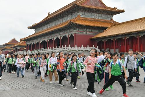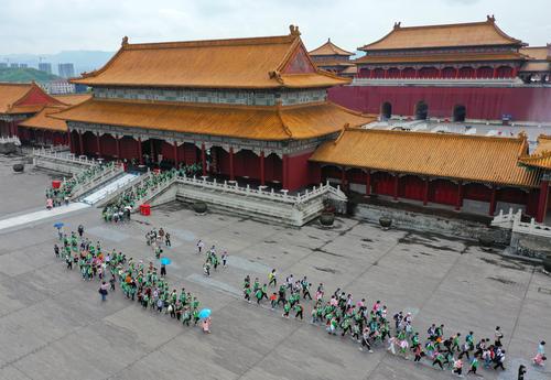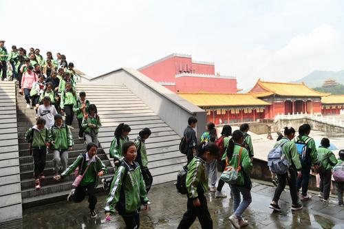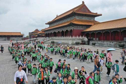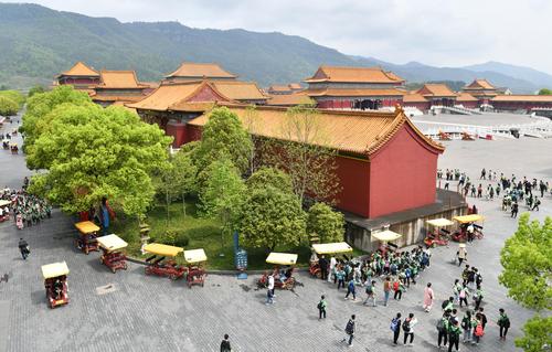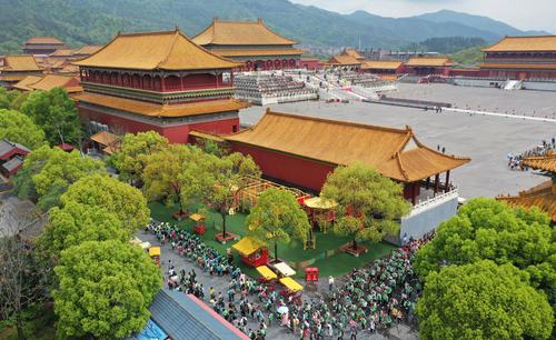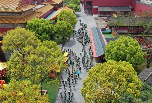 2021年4月1日,学生在浙江省东阳市横店影视城明清宫苑景区内春游研学。春暖花开是踏青春游的好时节,浙江省东阳市横店影视城各大景区也迎来学生春游感觉的小高潮。