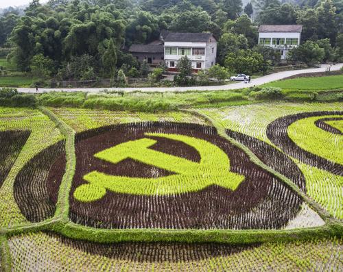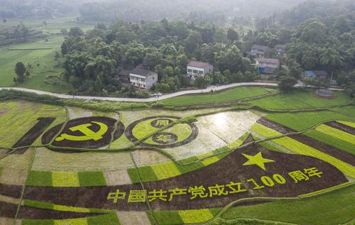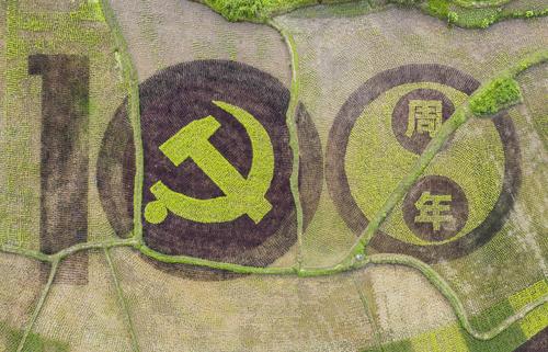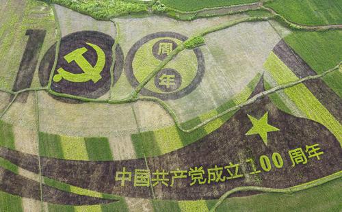 2021年6月13日,四川省广安市广安区彭家乡茶店村稻田里,用彩色水稻绘制出“中国共产党成立100周年”文字和党徽及“100”图案,为建党100周年献礼。