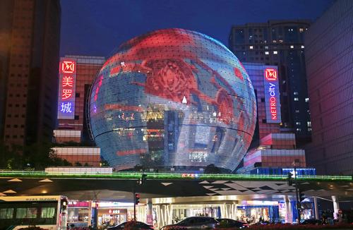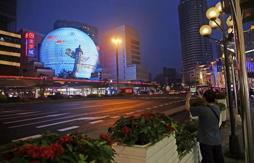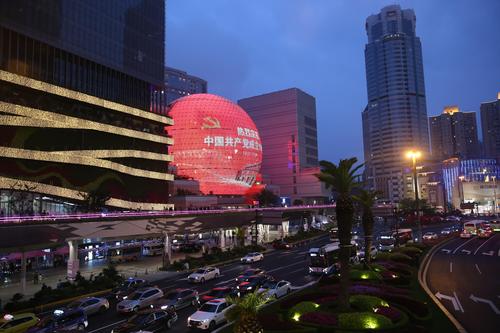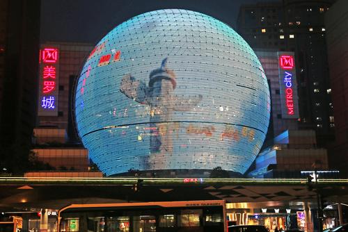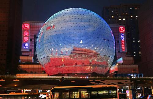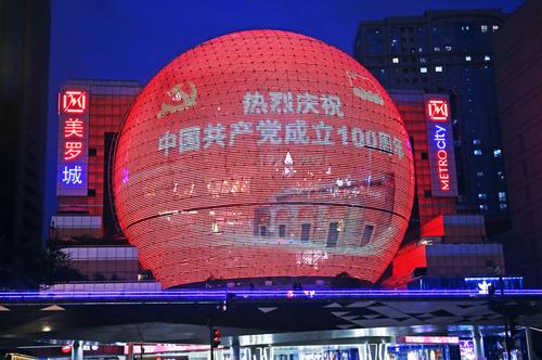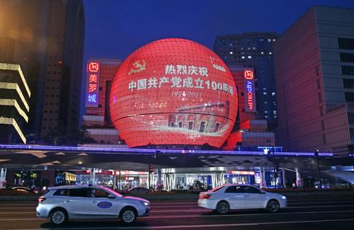 2021年6月13日,上海,徐家汇商业地标美罗城球形LED广告巨屏近日开始播放建党百年宣传片,一大会址、天安门城楼、华表等画面一一闪现,吸引不少市民游客驻足。