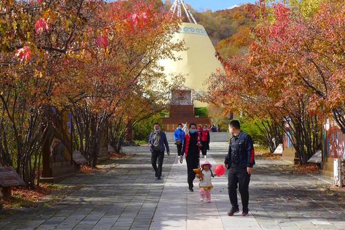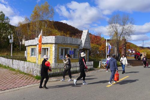 2021年10月1日,黑河市中俄民族风情园国庆假期金秋近郊游受热捧。人们或一家人或携好友来到黑河市中俄民族风情园游玩,秋高气爽、碧空如洗,登风情园祈福栈道,鸟瞰家乡美景。