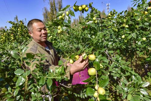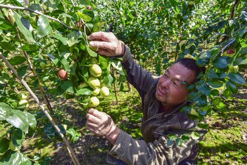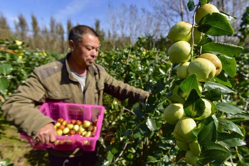 2021年10月11日,山东省青州市黄楼街道大贯店村,农民在采摘梨枣。金秋时节,果农们利用晴好天气抓紧采收供应市场。近年来该市采取“合作社+农户”“基地+农户”等模式因地制宜引导农民发展梨枣、冬枣等特色农业种植,促进了农业增效、农民增收。