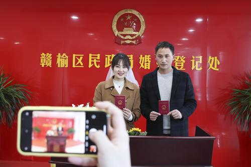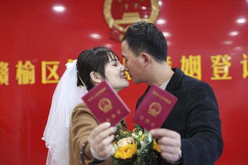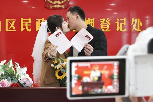 2021年11月11日,一对新人在江苏省连云港市赣榆区民政局婚姻登记处领证后拍照留念。11月11日被戏称为“光棍节”,江苏省连云港市赣榆区许多年轻情侣选择这一天登记结婚,告别单身。
