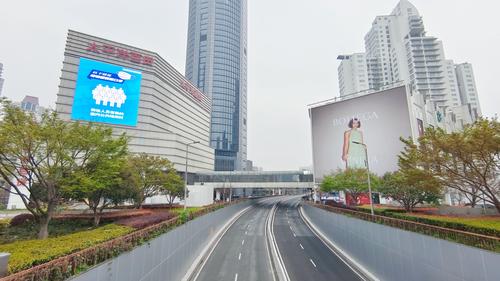 2022年3月19日,上海,疫情防控下的市中心商圈街头车辆、行人稀少,徐家汇各大商场依然开放但营业时间缩短,商城大屏幕上还循环播放着请市民游客戴口罩、少聚集的防疫宣传广告。申城近日展开全市网格化核酸筛查,不少社区因防疫封闭。