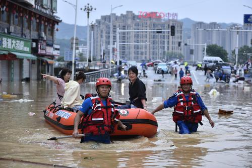 2022年6月19日,在位于福建省南平市建瓯市水南桥附近,蓝豹救援队利用橡皮艇转移被困群众。